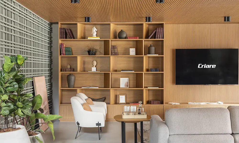 Os painéis ripados permanecem como protagonistas, acrescentando textura, ritmo visual e profundidade às paredes principais. A iluminação embutida, aplicada em nichos, sancas e painéis, cria diferentes cenários ao longo do dia e reforça o clima acolhedor no período noturno. Já os modulados oferecem flexibilidade ao projeto, permitindo adaptar o espaço conforme o uso, as mudanças na rotina e as novas necessidades da casa.