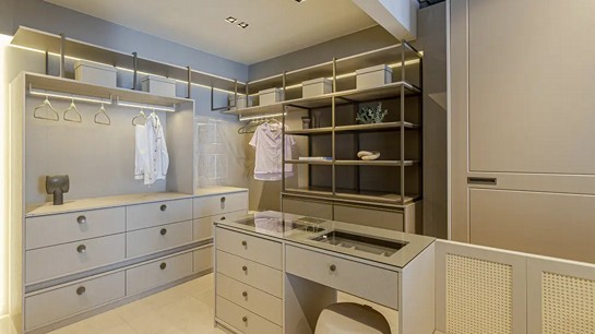 É comum que o closet feminino esteja integrado ou próximo a uma penteadeira, prevendo apoio para maquiagem, cuidados pessoais e uso de ferramentas térmicas, como secador e babyliss.